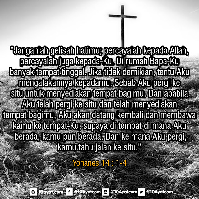 ”Janganlah gelisah hatimu; percayalah kepada Allah, percayalah juga kepada-Ku. Di rumah Bapa-Ku banyak tempat tinggal. Jika tidak demikian, tentu Aku mengatakannya kepadamu. Sebab Aku pergi ke situ untuk menyediakan tempat bagimu. Dan apabila Aku telah pergi ke situ dan telah menyediakan tempat bagimu, Aku akan datang kembali dan membawa kamu ke tempat-Ku, supaya di tempat di mana Aku berada, kamu pun berada. Dan ke mana Aku pergi, kamu tahu jalan ke situ.”