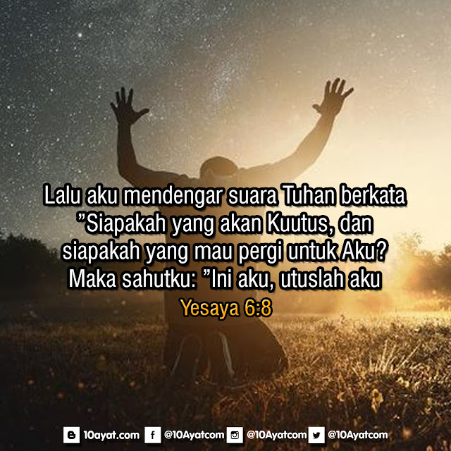 Lalu aku mendengar suara Tuhan berkata: ”Siapakah yang akan Kuutus, dan siapakah yang mau pergi untuk Aku?” Maka sahutku: ”Ini aku, utuslah aku!”
