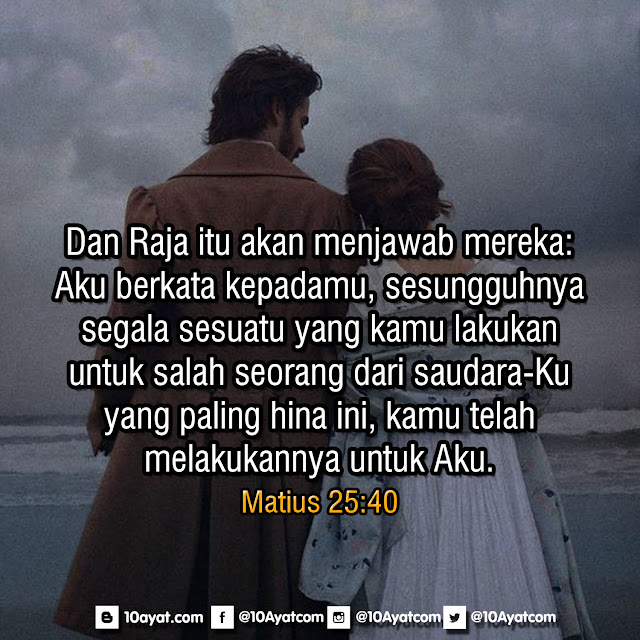 Dan Raja itu akan menjawab mereka: Aku berkata kepadamu, sesungguhnya segala sesuatu yang kamu lakukan untuk salah seorang dari saudara-Ku yang paling hina ini, kamu telah melakukannya untuk Aku.