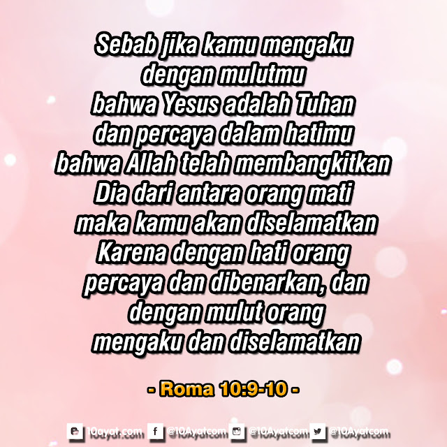 Sebab jika kamu mengaku dengan mulutmu, bahwa Yesus adalah Tuhan, dan percaya dalam hatimu, bahwa Allah telah membangkitkan Dia dari antara orang mati, maka kamu akan diselamatkan. Karena dengan hati orang percaya dan dibenarkan, dan dengan mulut orang mengaku dan diselamatkan.