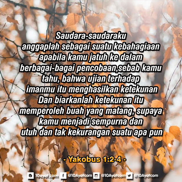 Saudara-saudaraku, anggaplah sebagai suatu kebahagiaan, apabila kamu jatuh ke dalam berbagai-bagai pencobaan, sebab kamu tahu, bahwa ujian terhadap imanmu itu menghasilkan ketekunan. Dan biarkanlah ketekunan itu memperoleh buah yang matang, supaya kamu menjadi sempurna dan utuh dan tak kekurangan suatu apa pun.