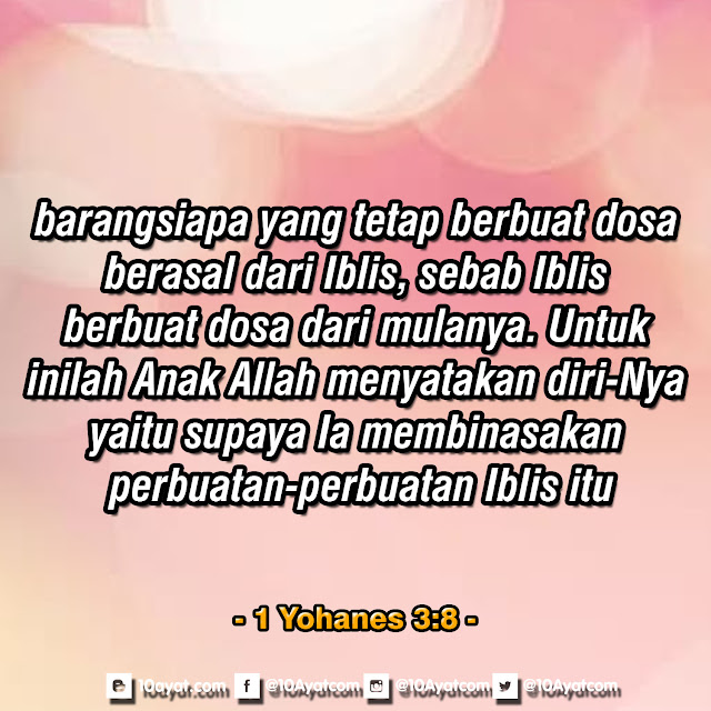 barangsiapa yang tetap berbuat dosa, berasal dari Iblis, sebab Iblis berbuat dosa dari mulanya. Untuk inilah Anak Allah menyatakan diri-Nya, yaitu supaya Ia membinasakan perbuatan-perbuatan Iblis itu.