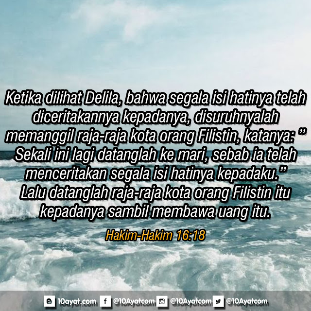 Ketika dilihat Delila, bahwa segala isi hatinya telah diceritakannya kepadanya, disuruhnyalah memanggil raja-raja kota orang Filistin, katanya: ”Sekali ini lagi datanglah ke mari, sebab ia telah menceritakan segala isi hatinya kepadaku.” Lalu datanglah raja-raja kota orang Filistin itu kepadanya sambil membawa uang itu.