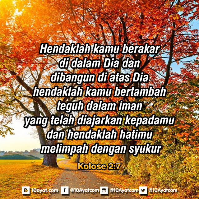 Hendaklah kamu berakar di dalam Dia dan dibangun di atas Dia, hendaklah kamu bertambah teguh dalam iman yang telah diajarkan kepadamu, dan hendaklah hatimu melimpah dengan syukur.