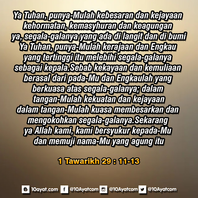Ya Tuhan, punya-Mulah kebesaran dan kejayaan, kehormatan, kemasyhuran dan keagungan, ya, segala-galanya yang ada di langit dan di bumi! Ya Tuhan, punya-Mulah kerajaan dan Engkau yang tertinggi itu melebihi segala-galanya sebagai kepala. Sebab kekayaan dan kemuliaan berasal dari pada-Mu dan Engkaulah yang berkuasa atas segala-galanya; dalam tangan-Mulah kekuatan dan kejayaan; dalam tangan-Mulah kuasa membesarkan dan mengokohkan segala-galanya. Sekarang, ya Allah kami, kami bersyukur kepada-Mu dan memuji nama-Mu yang agung itu.
