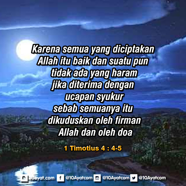 Karena semua yang diciptakan Allah itu baik dan suatu pun tidak ada yang haram, jika diterima dengan ucapan syukur, sebab semuanya itu dikuduskan oleh firman Allah dan oleh doa.