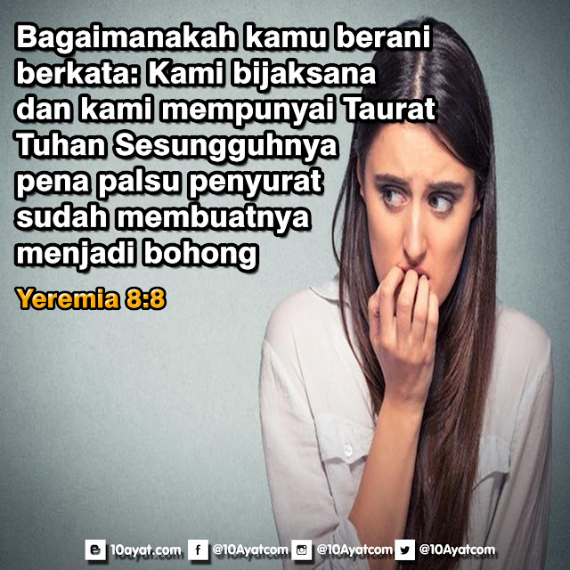 Bagaimanakah kamu berani berkata: Kami bijaksana, dan kami mempunyai Taurat Tuhan? Sesungguhnya, pena palsu penyurat sudah membuatnya menjadi bohong.