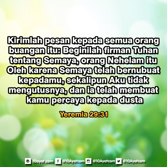 ”Kirimlah pesan kepada semua orang buangan itu: Beginilah firman Tuhan tentang Semaya, orang Nehelam itu: Oleh karena Semaya telah bernubuat kepadamu, sekalipun Aku tidak mengutusnya, dan ia telah membuat kamu percaya kepada dusta,