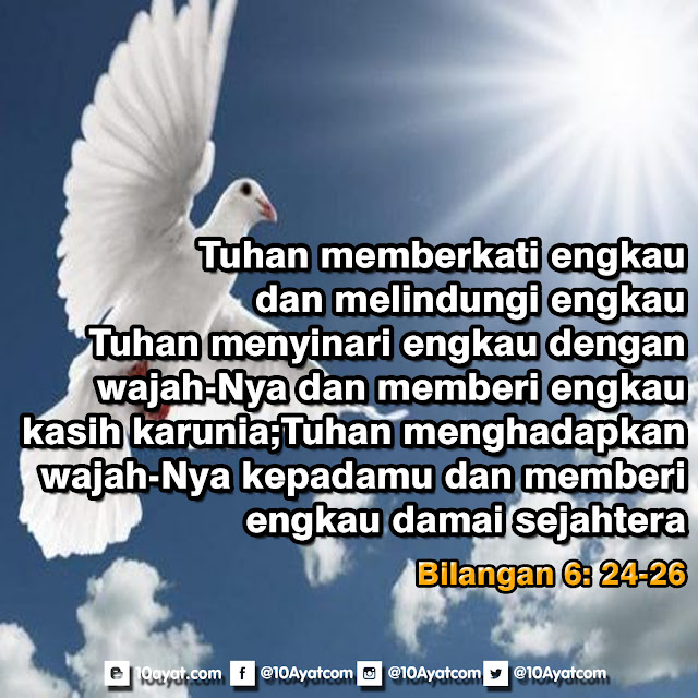TUHAN memberkati engkau dan melindungi engkau; TUHAN menyinari engkau dengan wajah-Nya dan memberi engkau kasih karunia; TUHAN menghadapkan wajah-Nya kepadamu dan memberi engkau damai sejahtera.