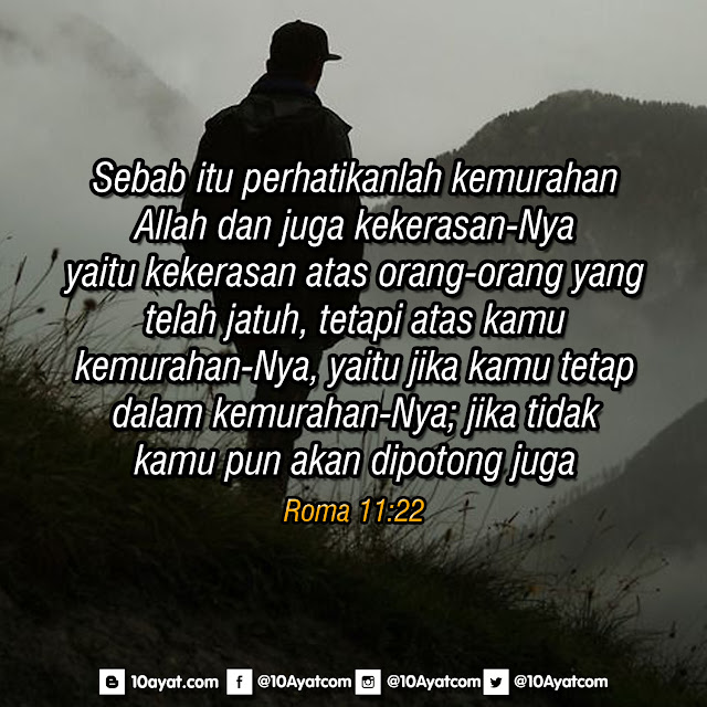 Sebab itu perhatikanlah kemurahan Allah dan juga kekerasan-Nya, yaitu kekerasan atas orang-orang yang telah jatuh, tetapi atas kamu kemurahan-Nya, yaitu jika kamu tetap dalam kemurahan-Nya; jika tidak, kamu pun akan dipotong juga.