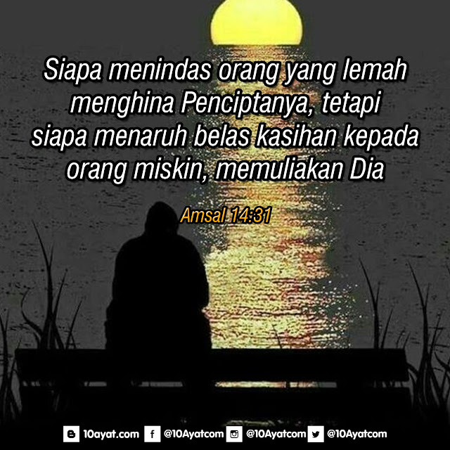 Siapa menindas orang yang lemah, menghina Penciptanya, tetapi siapa menaruh belas kasihan kepada orang miskin, memuliakan Dia.