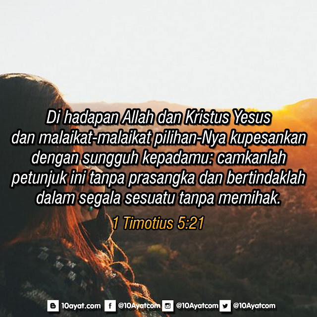 Di hadapan Allah dan Kristus Yesus dan malaikat-malaikat pilihan-Nya kupesankan dengan sungguh kepadamu: camkanlah petunjuk ini tanpa prasangka dan bertindaklah dalam segala sesuatu tanpa memihak.