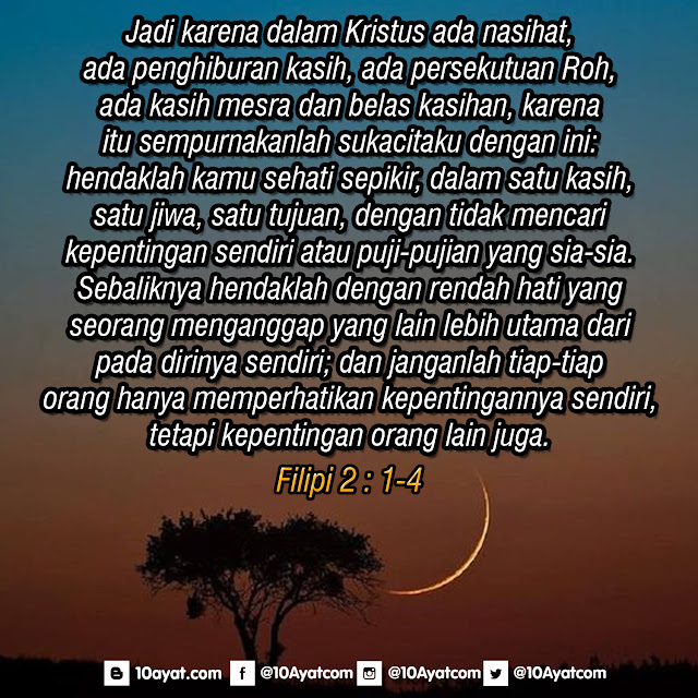Jadi karena dalam Kristus ada nasihat, ada penghiburan kasih, ada persekutuan Roh, ada kasih mesra dan belas kasihan, karena itu sempurnakanlah sukacitaku dengan ini: hendaklah kamu sehati sepikir, dalam satu kasih, satu jiwa, satu tujuan, dengan tidak mencari kepentingan sendiri atau puji-pujian yang sia-sia. Sebaliknya hendaklah dengan rendah hati yang seorang menganggap yang lain lebih utama dari pada dirinya sendiri; dan janganlah tiap-tiap orang hanya memperhatikan kepentingannya sendiri, tetapi kepentingan orang lain juga.