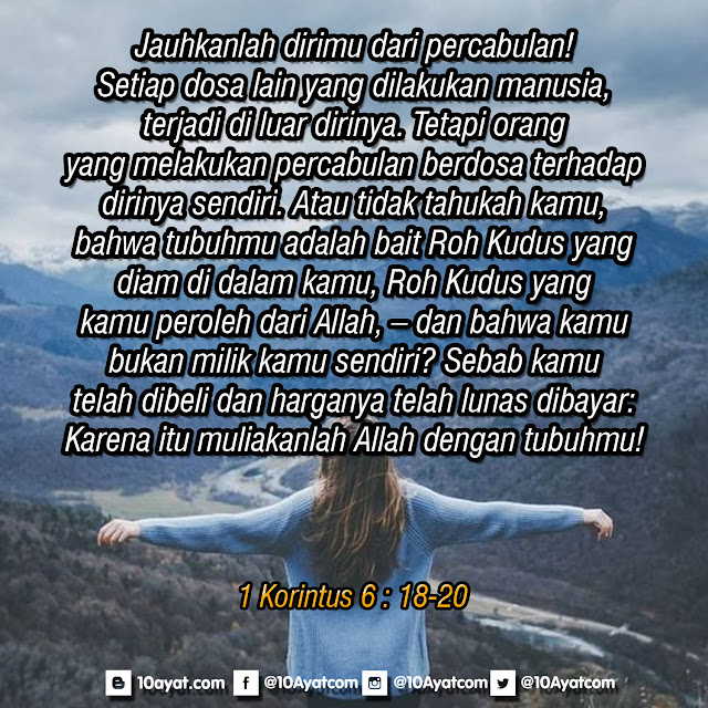 Jauhkanlah dirimu dari percabulan! Setiap dosa lain yang dilakukan manusia, terjadi di luar dirinya. Tetapi orang yang melakukan percabulan berdosa terhadap dirinya sendiri. Atau tidak tahukah kamu, bahwa tubuhmu adalah bait Roh Kudus yang diam di dalam kamu, Roh Kudus yang kamu peroleh dari Allah, – dan bahwa kamu bukan milik kamu sendiri? Sebab kamu telah dibeli dan harganya telah lunas dibayar: Karena itu muliakanlah Allah dengan tubuhmu!