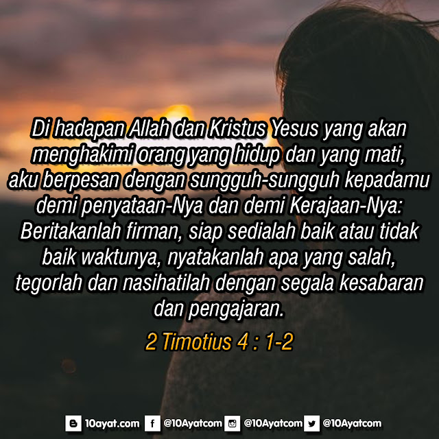 Di hadapan Allah dan Kristus Yesus yang akan menghakimi orang yang hidup dan yang mati, aku berpesan dengan sungguh-sungguh kepadamu demi penyataan-Nya dan demi Kerajaan-Nya: Beritakanlah firman, siap sedialah baik atau tidak baik waktunya, nyatakanlah apa yang salah, tegorlah dan nasihatilah dengan segala kesabaran dan pengajaran.