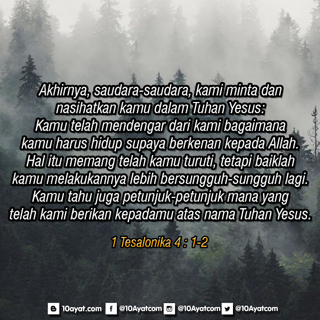 Akhirnya, saudara-saudara, kami minta dan nasihatkan kamu dalam Tuhan Yesus: Kamu telah mendengar dari kami bagaimana kamu harus hidup supaya berkenan kepada Allah. Hal itu memang telah kamu turuti, tetapi baiklah kamu melakukannya lebih bersungguh-sungguh lagi. Kamu tahu juga petunjuk-petunjuk mana yang telah kami berikan kepadamu atas nama Tuhan Yesus.