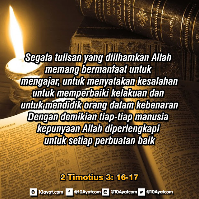 Segala tulisan yang diilhamkan Allah memang bermanfaat untuk mengajar, untuk menyatakan kesalahan, untuk memperbaiki kelakuan dan untuk mendidik orang dalam kebenaran. Dengan demikian tiap-tiap manusia kepunyaan Allah diperlengkapi untuk setiap perbuatan baik.