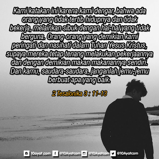 Kami katakan ini karena kami dengar, bahwa ada orang yang tidak tertib hidupnya dan tidak bekerja, melainkan sibuk dengan hal-hal yang tidak berguna. Orang-orang yang demikian kami peringati dan nasihati dalam Tuhan Yesus Kristus, supaya mereka tetap tenang melakukan pekerjaannya dan dengan demikian makan makanannya sendiri. Dan kamu, saudara-saudara, janganlah jemu-jemu berbuat apa yang baik.