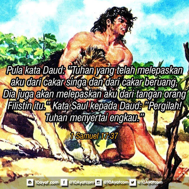 Pula kata Daud: ”Tuhan yang telah melepaskan aku dari cakar singa dan dari cakar beruang, Dia juga akan melepaskan aku dari tangan orang Filistin itu.” Kata Saul kepada Daud: ”Pergilah! Tuhan menyertai engkau.”