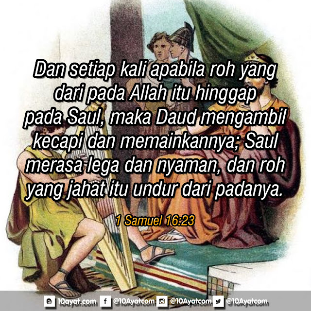 Dan setiap kali apabila roh yang dari pada Allah itu hinggap pada Saul, maka Daud mengambil kecapi dan memainkannya; Saul merasa lega dan nyaman, dan roh yang jahat itu undur dari padanya.