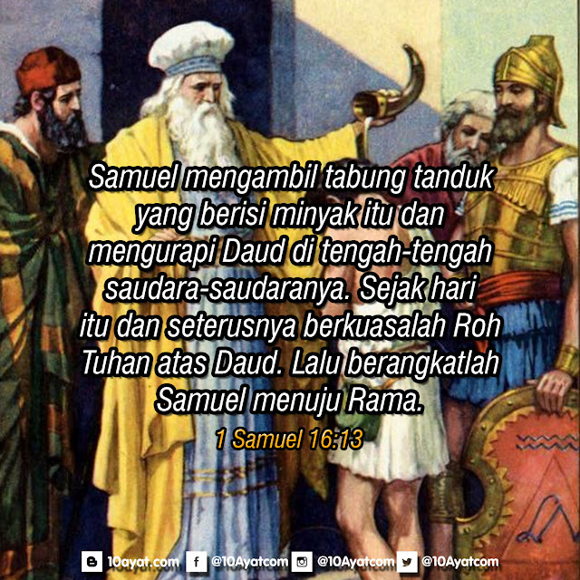 Samuel mengambil tabung tanduk yang berisi minyak itu dan mengurapi Daud di tengah-tengah saudara-saudaranya. Sejak hari itu dan seterusnya berkuasalah Roh Tuhan atas Daud. Lalu berangkatlah Samuel menuju Rama.