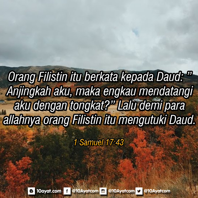 Orang Filistin itu berkata kepada Daud: ”Anjingkah aku, maka engkau mendatangi aku dengan tongkat?” Lalu demi para allahnya orang Filistin itu mengutuki Daud.