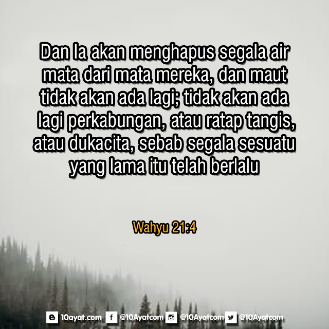 Dan Ia akan menghapus segala air mata dari mata mereka, dan maut tidak akan ada lagi; tidak akan ada lagi perkaungan, atau ratap tangis, atau dukacita, sebab segala sesuatu yang lama itu telah berlalu.”