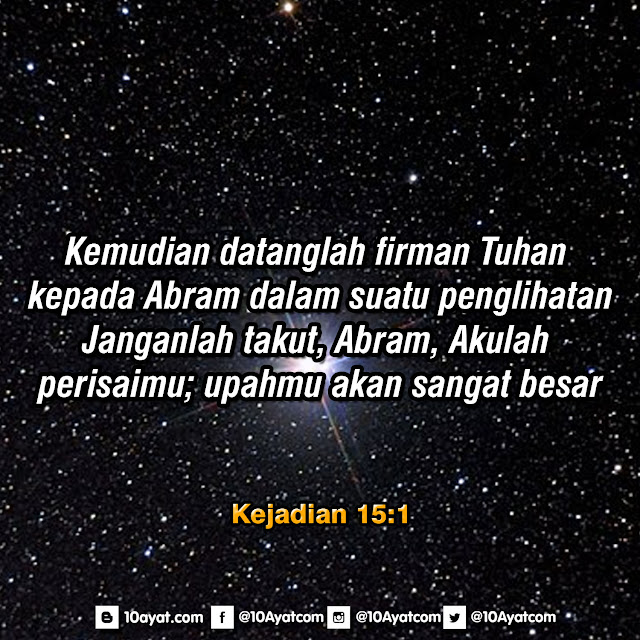 Kemudian datanglah firman Tuhan kepada Abram dalam suatu penglihatan: ”Janganlah takut, Abram, Akulah perisaimu; upahmu akan sangat besar.”