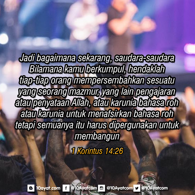 Jadi bagaimana sekarang, saudara-saudara? Bilamana kamu berkumpul, hendaklah tiap-tiap orang mempersembahkan sesuatu: yang seorang mazmur, yang lain pengajaran, atau penyataan Allah, atau karunia bahasa roh, atau karunia untuk menafsirkan bahasa roh, tetapi semuanya itu harus dipergunakan untuk membangun.