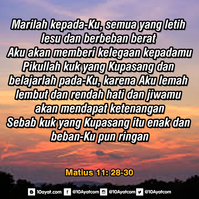 Marilah kepada-Ku, semua yang letih lesu dan berbeban berat, Aku akan memberi kelegaan kepadamu. Pikullah kuk yang Kupasang dan belajarlah pada-Ku, karena Aku lemah lembut dan rendah hati dan jiwamu akan mendapat ketenangan. Sebab kuk yang Kupasang itu enak dan beban-Ku pun ringan.”