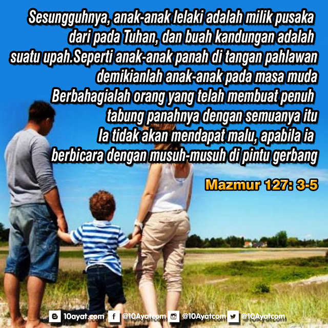 Sesungguhnya, anak-anak lelaki adalah milik pusaka dari pada Tuhan, dan buah kandungan adalah suatu upah. Seperti anak-anak panah di tangan pahlawan, demikianlah anak-anak pada masa muda. Berbahagialah orang yang telah membuat penuh tabung panahnya dengan semuanya itu. Ia tidak akan mendapat malu, apabila ia berbicara dengan musuh-musuh di pintu gerbang.
