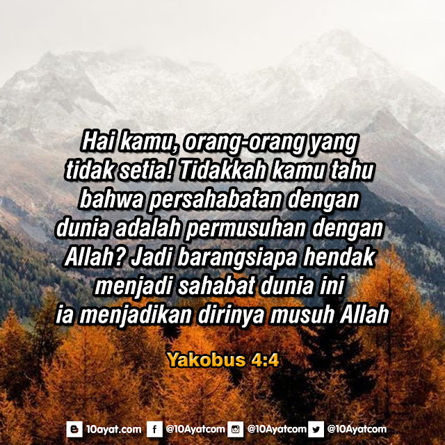 Hai kamu, orang-orang yang tidak setia! Tidakkah kamu tahu, bahwa persahabatan dengan dunia adalah permusuhan dengan Allah? Jadi barangsiapa hendak menjadi sahabat dunia ini, ia menjadikan dirinya musuh Allah.