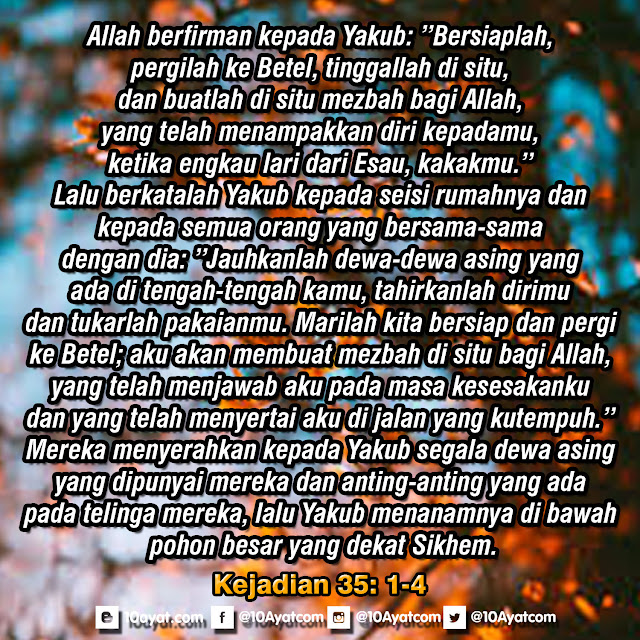 Allah berfirman kepada Yakub: ”Bersiaplah, pergilah ke Betel, tinggallah di situ, dan buatlah di situ mezbah bagi Allah, yang telah menampakkan diri kepadamu, ketika engkau lari dari Esau, kakakmu.” Lalu berkatalah Yakub kepada seisi rumahnya dan kepada semua orang yang bersama-sama dengan dia: ”Jauhkanlah dewa-dewa asing yang ada di tengah-tengah kamu, tahirkanlah dirimu dan tukarlah pakaianmu. Marilah kita bersiap dan pergi ke Betel; aku akan membuat mezbah di situ bagi Allah, yang telah menjawab aku pada masa kesesakanku dan yang telah menyertai aku di jalan yang kutempuh.” Mereka menyerahkan kepada Yakub segala dewa asing yang dipunyai mereka dan anting-anting yang ada pada telinga mereka, lalu Yakub menanamnya di bawah pohon besar yang dekat Sikhem.
