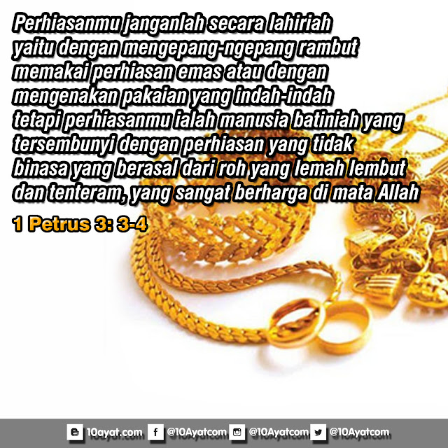 Perhiasanmu janganlah secara lahiriah, yaitu dengan mengepang-ngepang rambut, memakai perhiasan emas atau dengan mengenakan pakaian yang indah-indah, tetapi perhiasanmu ialah manusia batiniah yang tersembunyi dengan perhiasan yang tidak binasa yang berasal dari roh yang lemah lembut dan tenteram, yang sangat berharga di mata Allah.