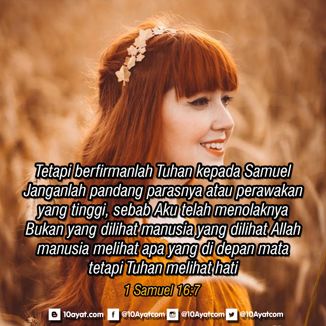 Tetapi berfirmanlah Tuhan kepada Samuel: ”Janganlah pandang parasnya atau perawakan yang tinggi, sebab Aku telah menolaknya. Bukan yang dilihat manusia yang dilihat Allah; manusia melihat apa yang di depan mata, tetapi Tuhan melihat hati.”