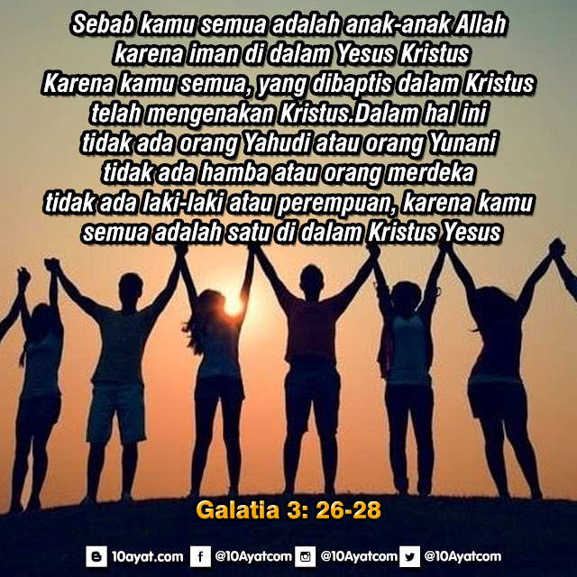 Sebab kamu semua adalah anak-anak Allah karena iman di dalam Yesus Kristus. Karena kamu semua, yang dibaptis dalam Kristus, telah mengenakan Kristus. Dalam hal ini tidak ada orang Yahudi atau orang Yunani, tidak ada hamba atau orang merdeka, tidak ada laki-laki atau perempuan, karena kamu semua adalah satu di dalam Kristus Yesus.