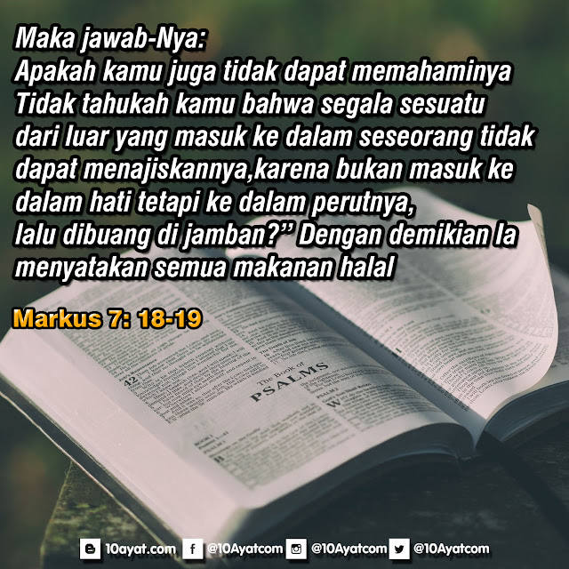Maka jawab-Nya: ”Apakah kamu juga tidak dapat memahaminya? Tidak tahukah kamu bahwa segala sesuatu dari luar yang masuk ke dalam seseorang tidak dapat menajiskannya, karena bukan masuk ke dalam hati tetapi ke dalam perutnya, lalu dibuang di jamban?” Dengan demikian Ia menyatakan semua makanan halal.