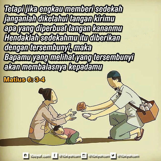 Tetapi jika engkau memberi sedekah, janganlah diketahui tangan kirimu apa yang diperbuat tangan kananmu. Hendaklah sedekahmu itu diberikan dengan tersembunyi, maka Bapamu yang melihat yang tersembunyi akan membalasnya kepadamu.”
