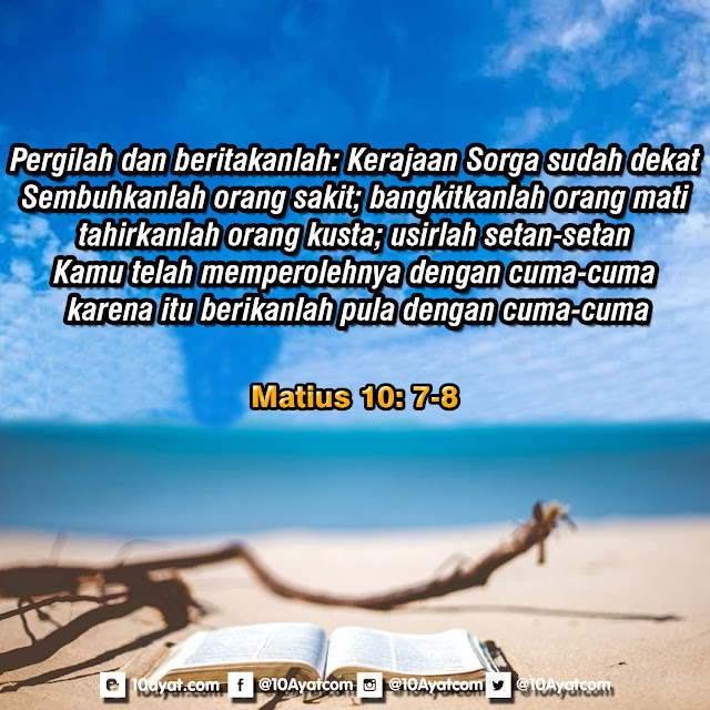 Pergilah dan beritakanlah: Kerajaan Sorga sudah dekat. Sembuhkanlah orang sakit; bangkitkanlah orang mati; tahirkanlah orang kusta; usirlah setan-setan. Kamu telah memperolehnya dengan cuma-cuma, karena itu berikanlah pula dengan cuma-cuma.
