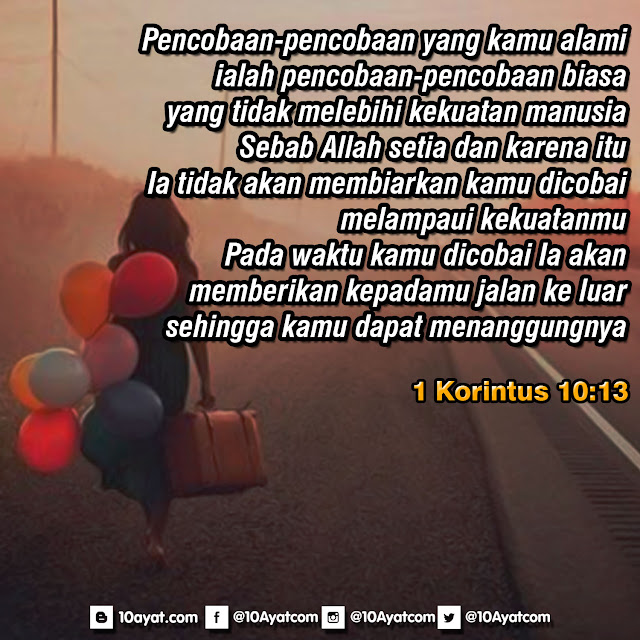 Pencobaan-pencobaan yang kamu alami ialah pencobaan-pencobaan biasa, yang tidak melebihi kekuatan manusia. Sebab Allah setia dan karena itu Ia tidak akan membiarkan kamu dicobai melampaui kekuatanmu. Pada waktu kamu dicobai Ia akan memberikan kepadamu jalan ke luar, sehingga kamu dapat menanggungnya.