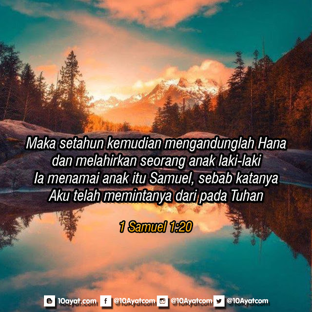 Maka setahun kemudian mengandunglah Hana dan melahirkan seorang anak laki-laki. Ia menamai anak itu Samuel, sebab katanya: ”Aku telah memintanya dari pada Tuhan.”