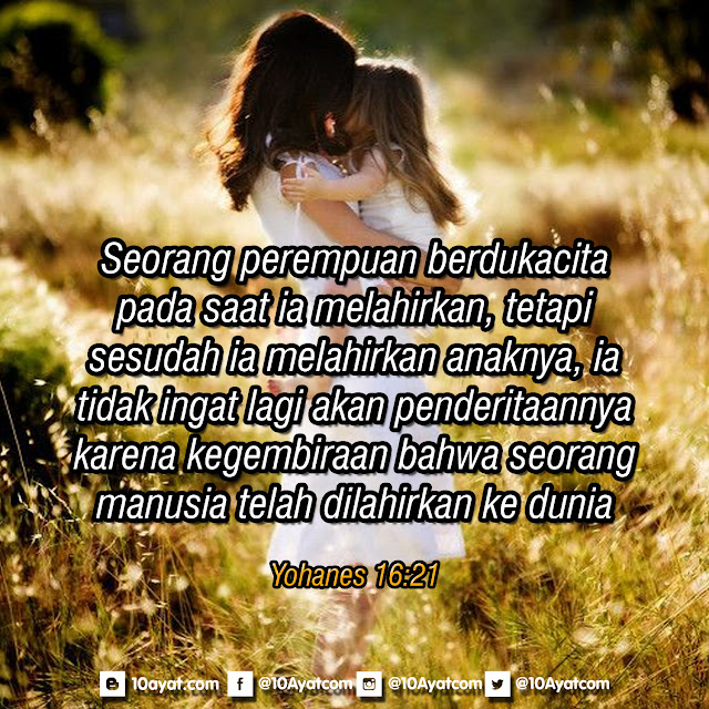 Seorang perempuan berdukacita pada saat ia melahirkan, tetapi sesudah ia melahirkan anaknya, ia tidak ingat lagi akan penderitaannya, karena kegembiraan bahwa seorang manusia telah dilahirkan ke dunia.