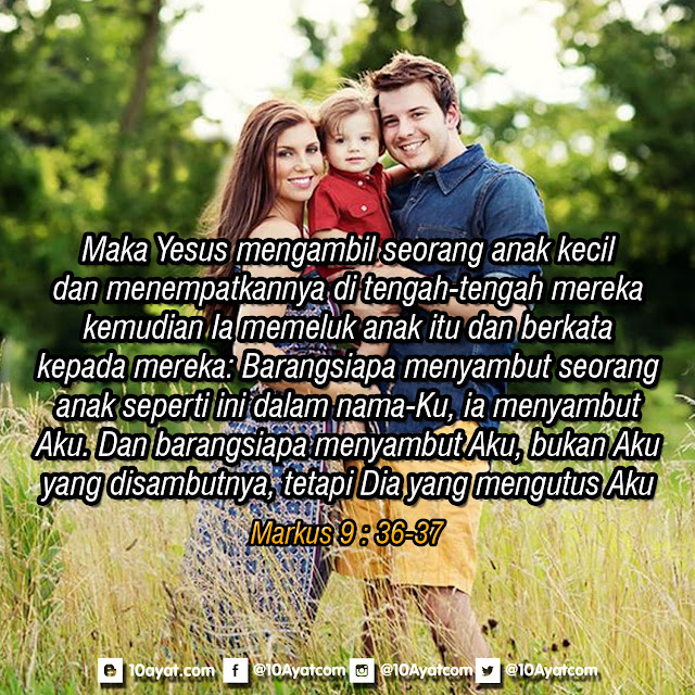 Maka Yesus mengambil seorang anak kecil dan menempatkannya di tengah-tengah mereka, kemudian Ia memeluk anak itu dan berkata kepada mereka: ”Barangsiapa menyambut seorang anak seperti ini dalam nama-Ku, ia menyambut Aku. Dan barangsiapa menyambut Aku, bukan Aku yang disambutnya, tetapi Dia yang mengutus Aku.”
