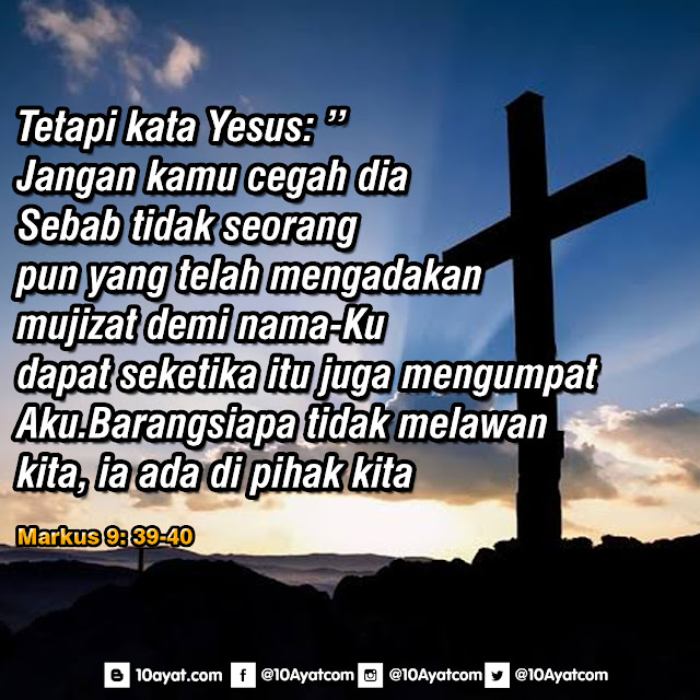 Tetapi kata Yesus: ”Jangan kamu cegah dia! Sebab tidak seorang pun yang telah mengadakan mujizat demi nama-Ku, dapat seketika itu juga mengumpat Aku. Barangsiapa tidak melawan kita, ia ada di pihak kita.