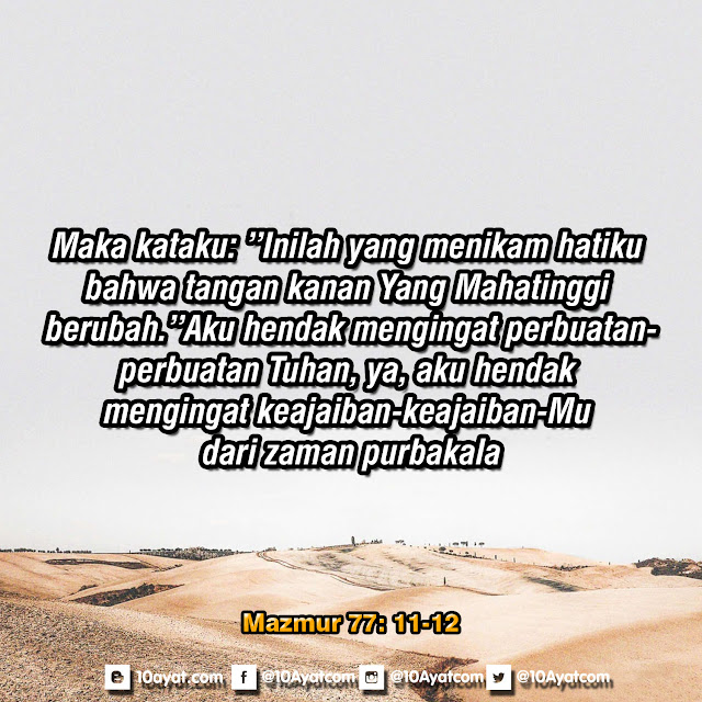 Maka kataku: ”Inilah yang menikam hatiku, bahwa tangan kanan Yang Mahatinggi berubah. Aku hendak mengingat perbuatan-perbuatan Tuhan, ya, aku hendak mengingat keajaiban-keajaiban-Mu dari zaman purbakala.