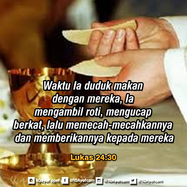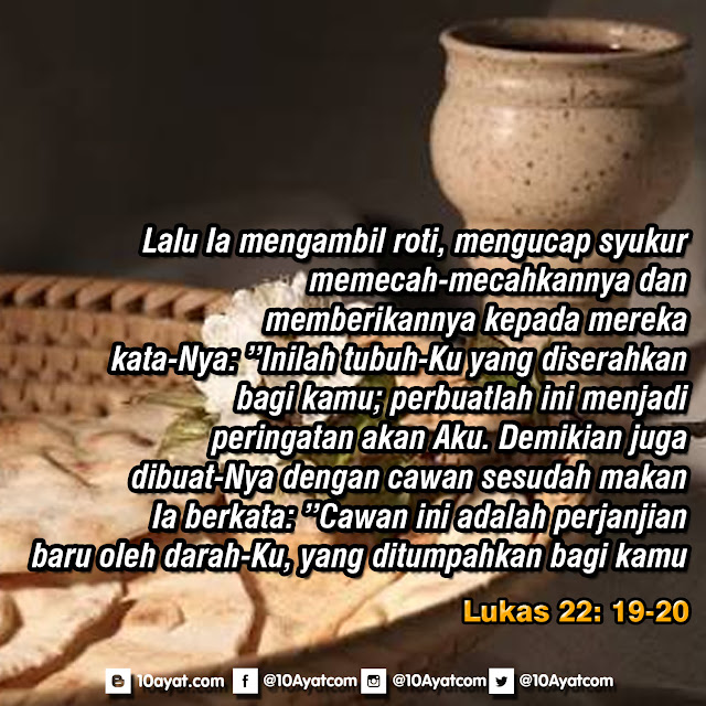 Lalu Ia mengambil roti, mengucap syukur, memecah-mecahkannya dan memberikannya kepada mereka, kata-Nya: ”Inilah tubuh-Ku yang diserahkan bagi kamu; perbuatlah ini menjadi peringatan akan Aku.” Demikian juga dibuat-Nya dengan cawan sesudah makan; Ia berkata: ”Cawan ini adalah perjanjian baru oleh darah-Ku, yang ditumpahkan bagi kamu.