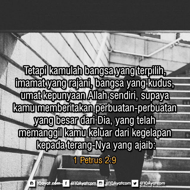 Tetapi kamulah bangsa yang terpilih, imamat yang rajani, bangsa yang kudus, umat kepunyaan Allah sendiri, supaya kamu memberitakan perbuatan-perbuatan yang besar dari Dia, yang telah memanggil kamu keluar dari kegelapan kepada terang-Nya yang ajaib:
