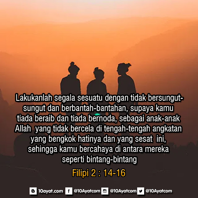 Lakukanlah segala sesuatu dengan tidak bersungut-sungut dan berbantah-bantahan, supaya kamu tiada beraib dan tiada bernoda, sebagai anak-anak Allah yang tidak bercela di tengah-tengah angkatan yang bengkok hatinya dan yang sesat ini, sehingga kamu bercahaya di antara mereka seperti bintang-bintang