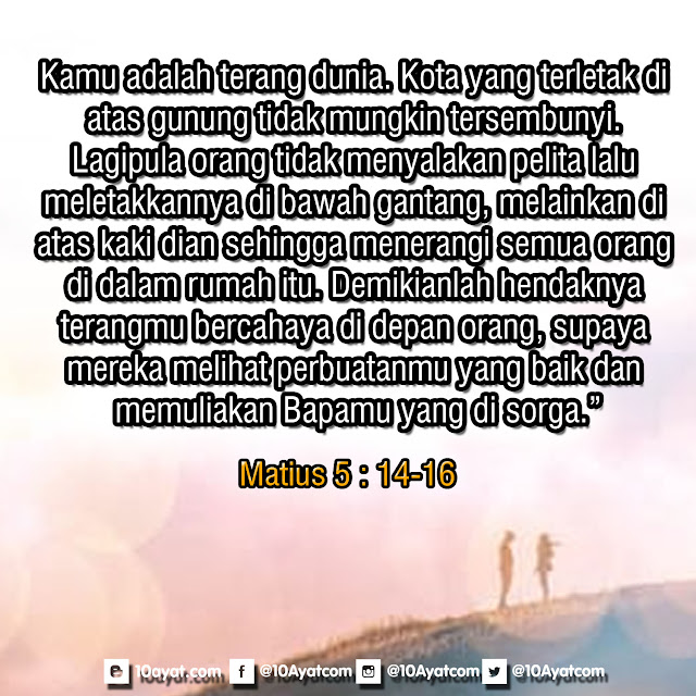 Kamu adalah terang dunia. Kota yang terletak di atas gunung tidak mungkin tersembunyi. Lagipula orang tidak menyalakan pelita lalu meletakkannya di bawah gantang, melainkan di atas kaki dian sehingga menerangi semua orang di dalam rumah itu. Demikianlah hendaknya terangmu bercahaya di depan orang, supaya mereka melihat perbuatanmu yang baik dan memuliakan Bapamu yang di sorga.”