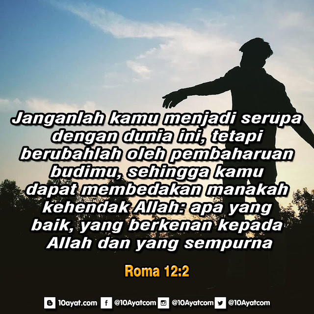 Janganlah kamu menjadi serupa dengan dunia ini, tepai berubahlah oleh pembaharuan budimu, sehingga kamu dapat membedakan manakah kehendak Allah: apa yang baik, yang berkenan kepada Allah dan yang sempurna.